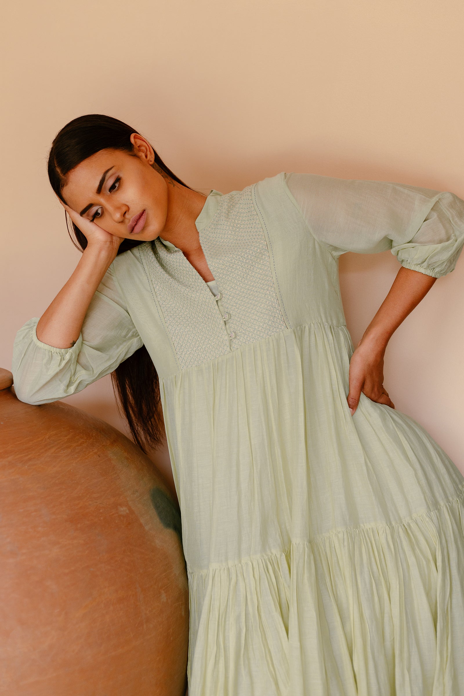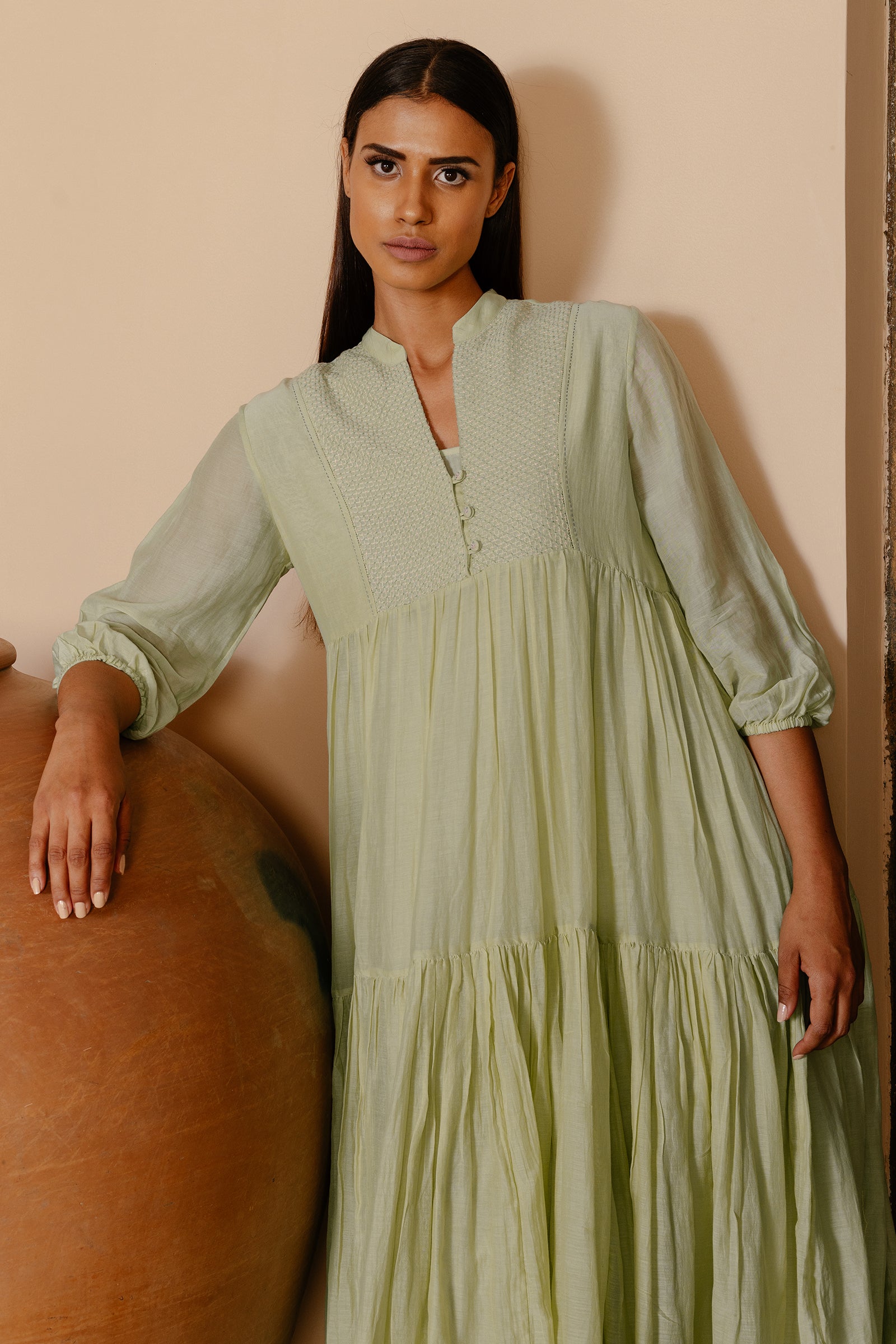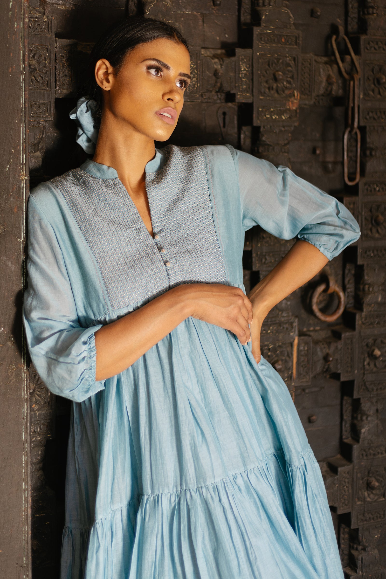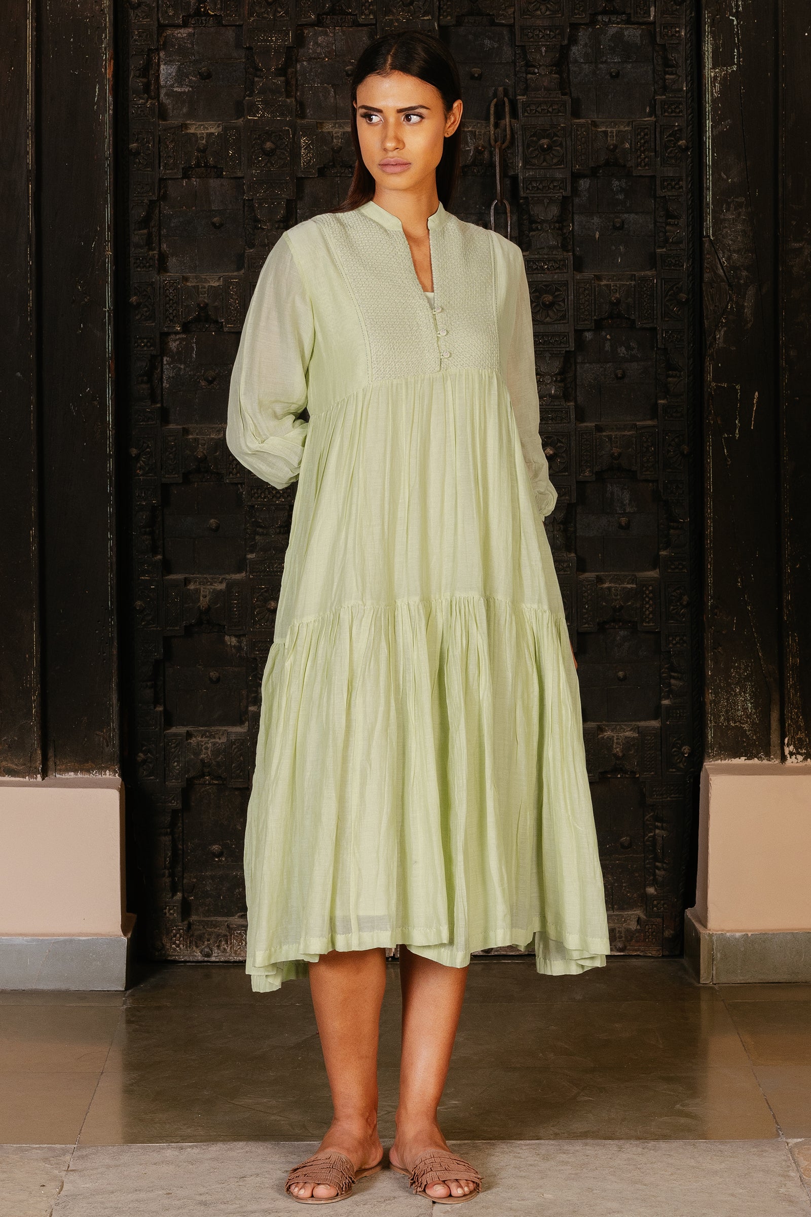 Tiered dress with hand embroidered yoke paired with spaghetti cotton lining