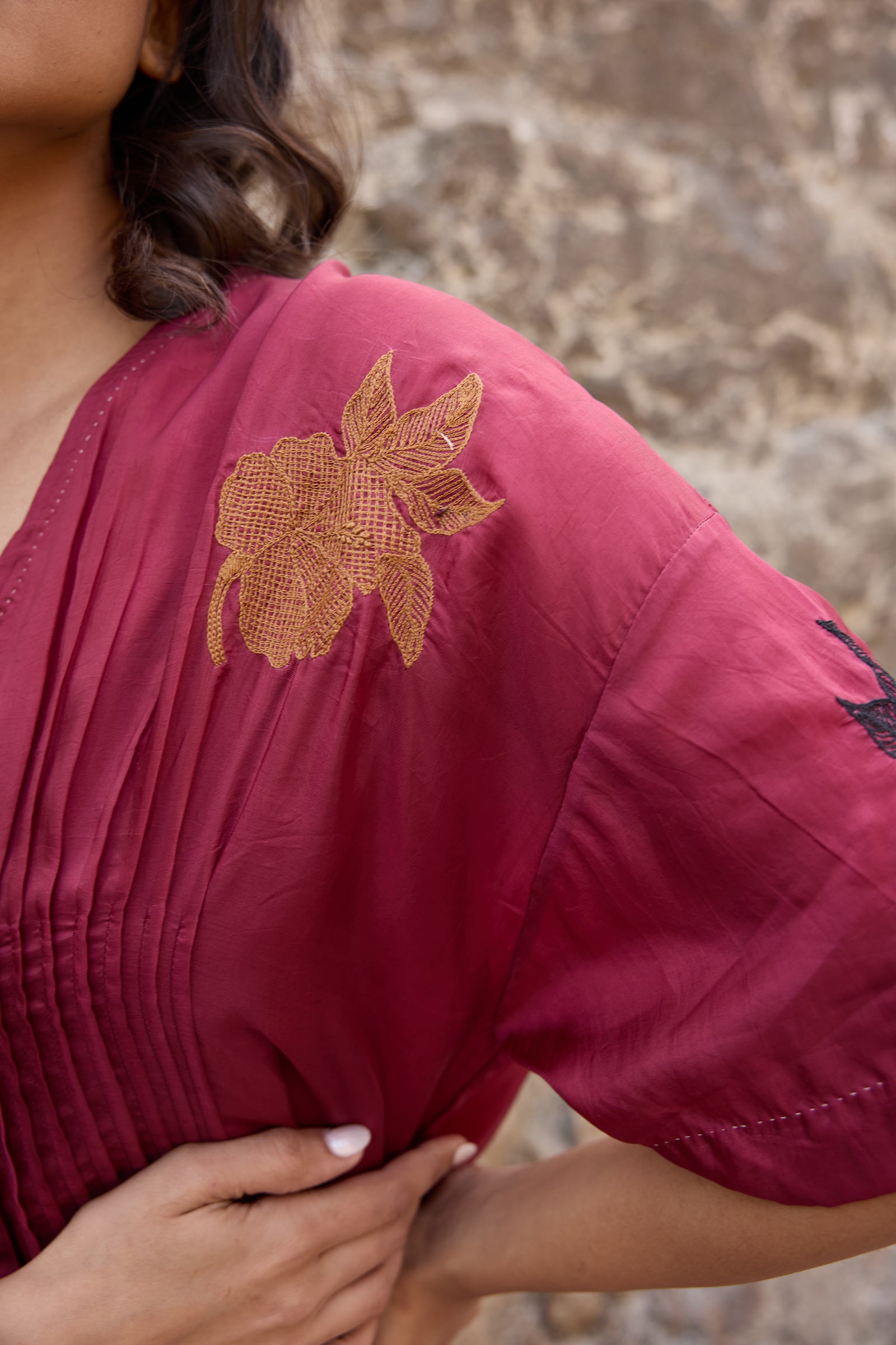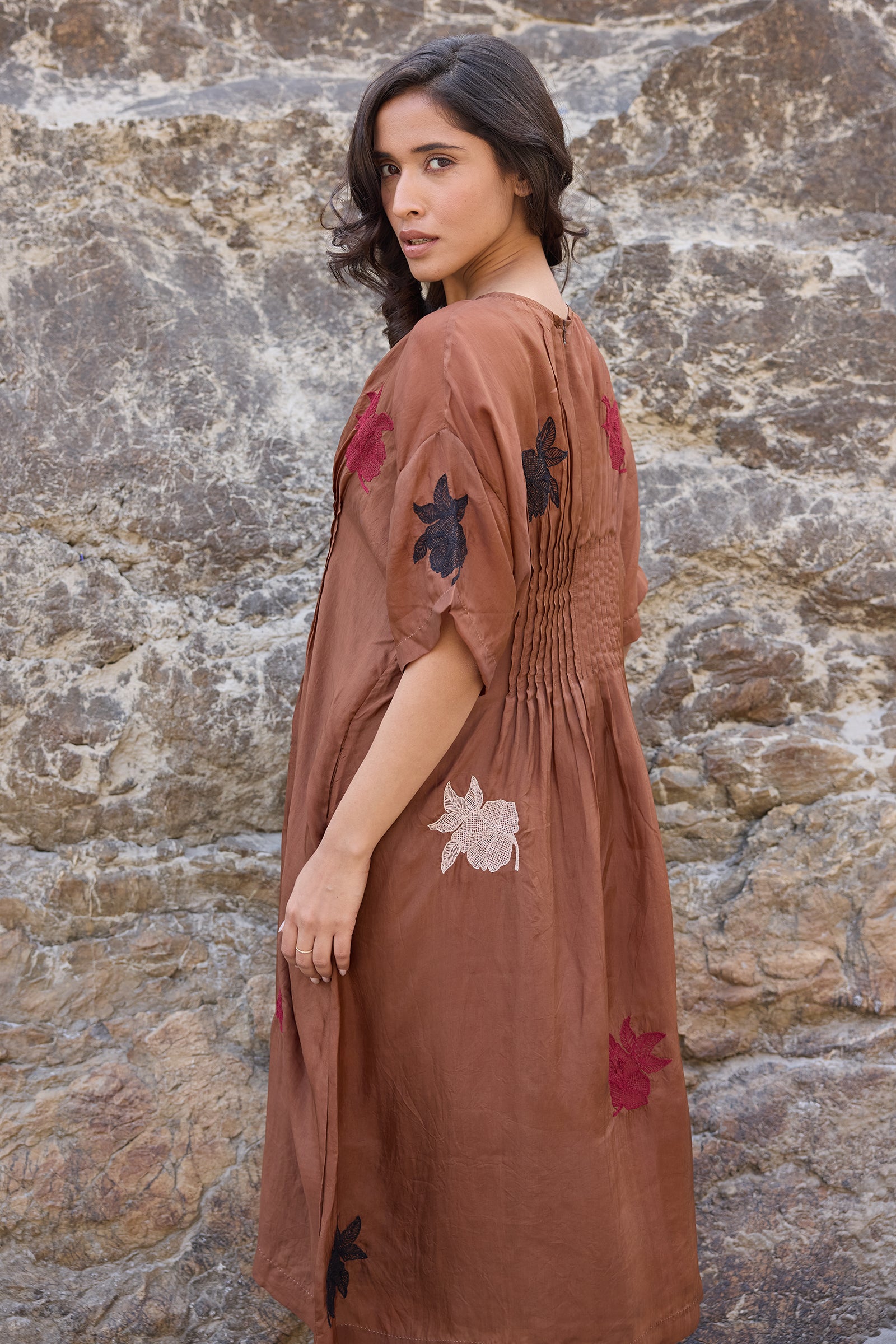 Waist pintuck dress with allover hand embroidered floral motifs