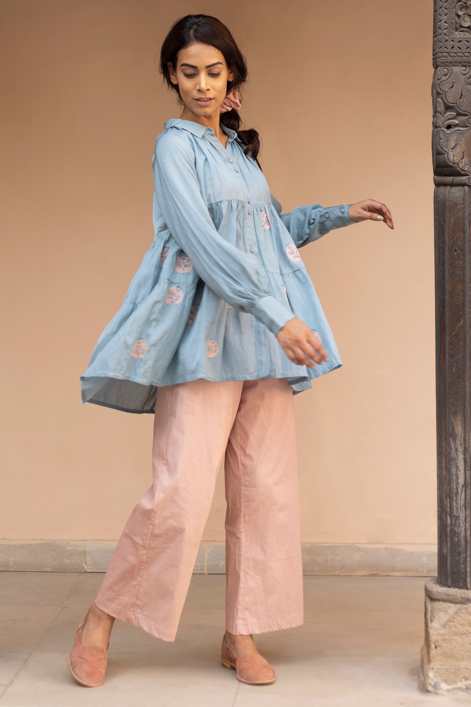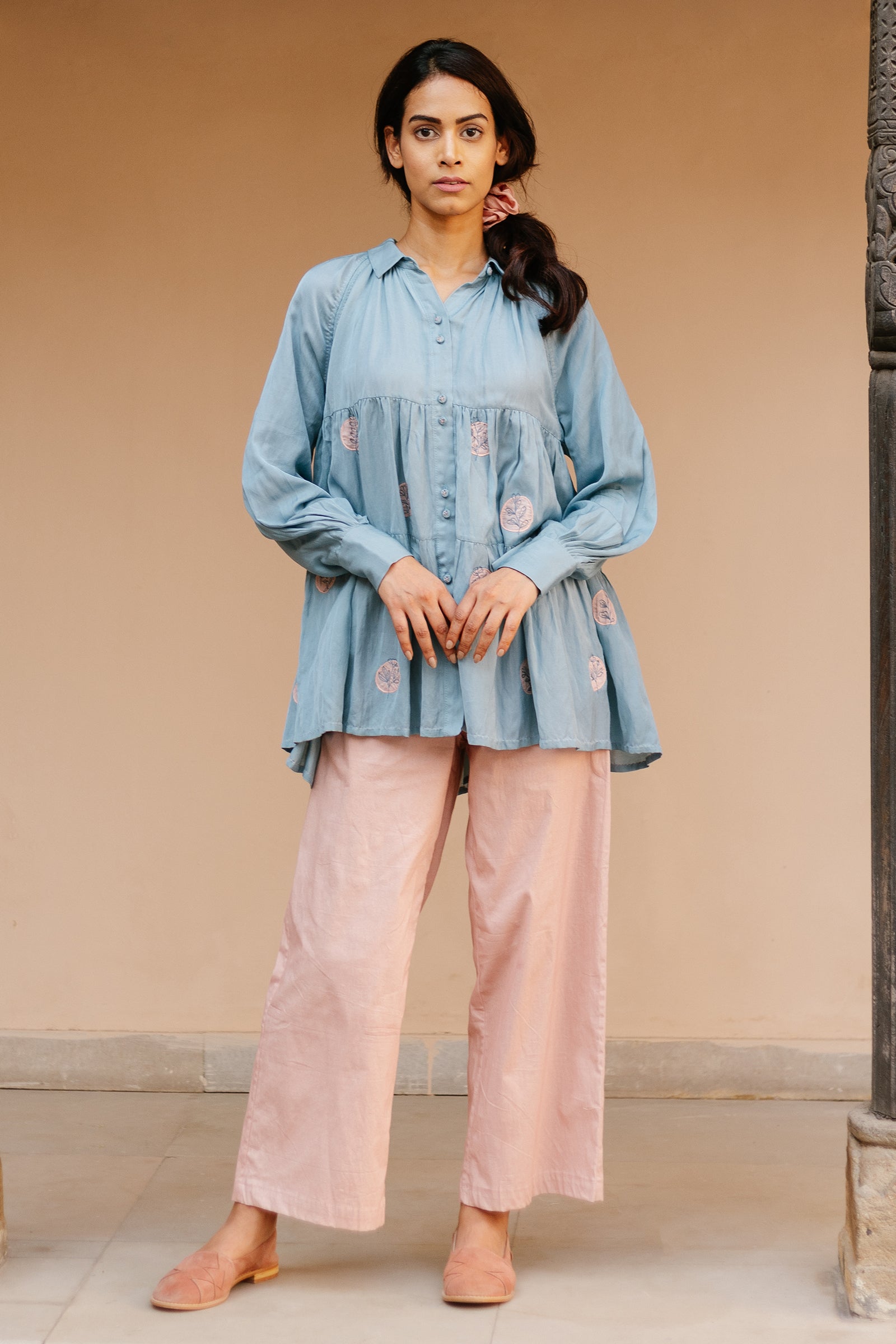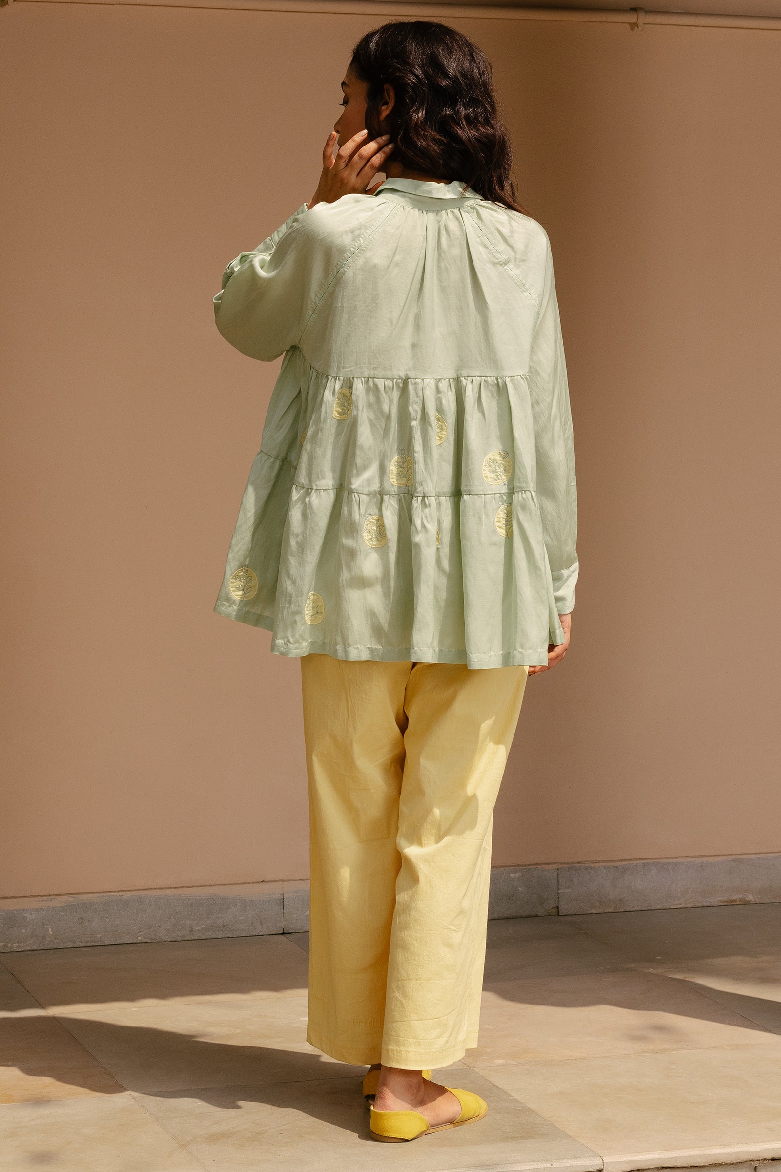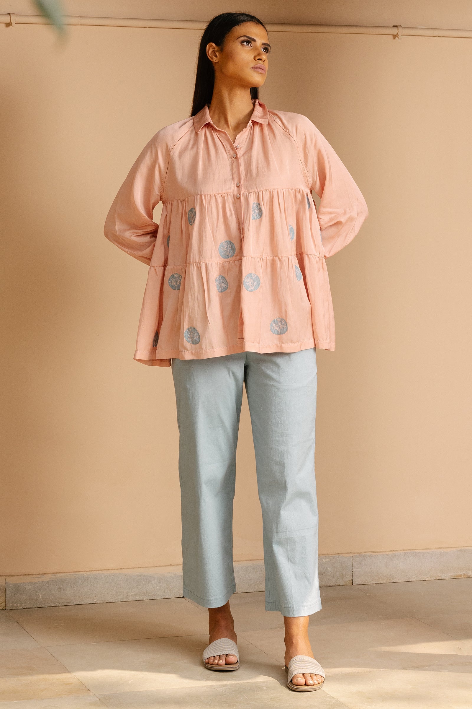 Tiered top with raglan sleeves and hand embroidered polka patchwork