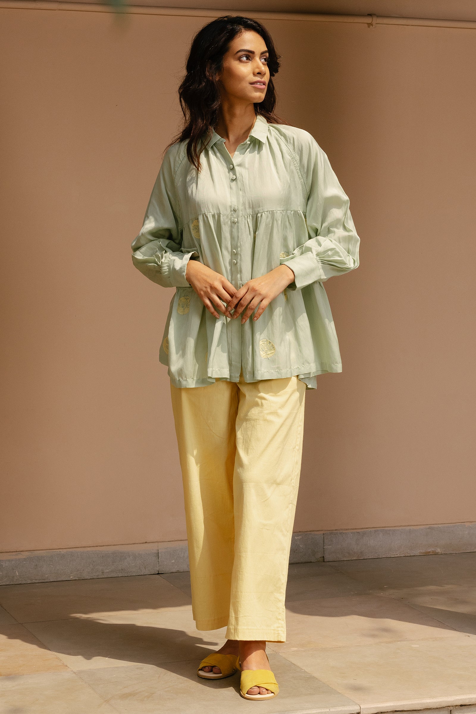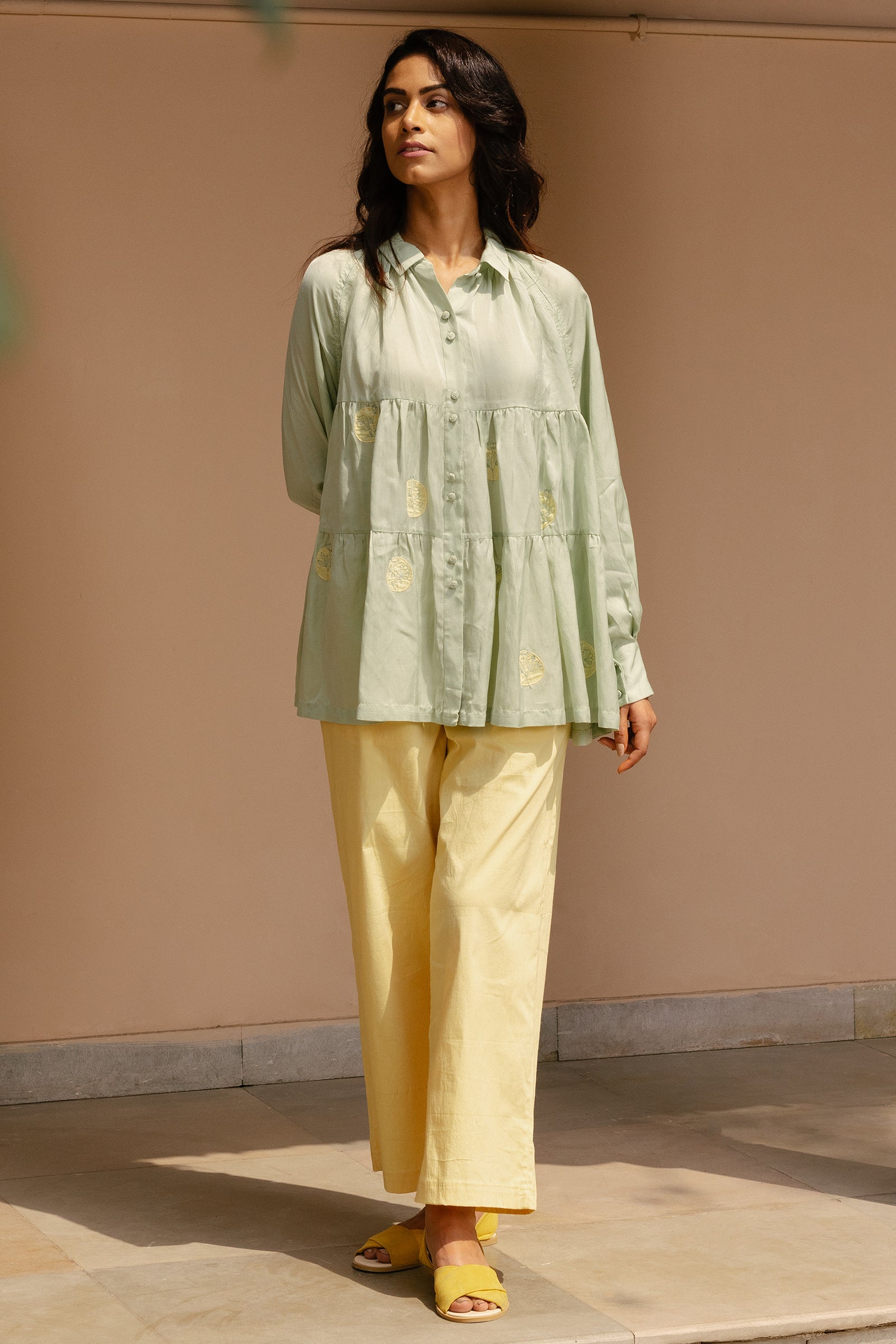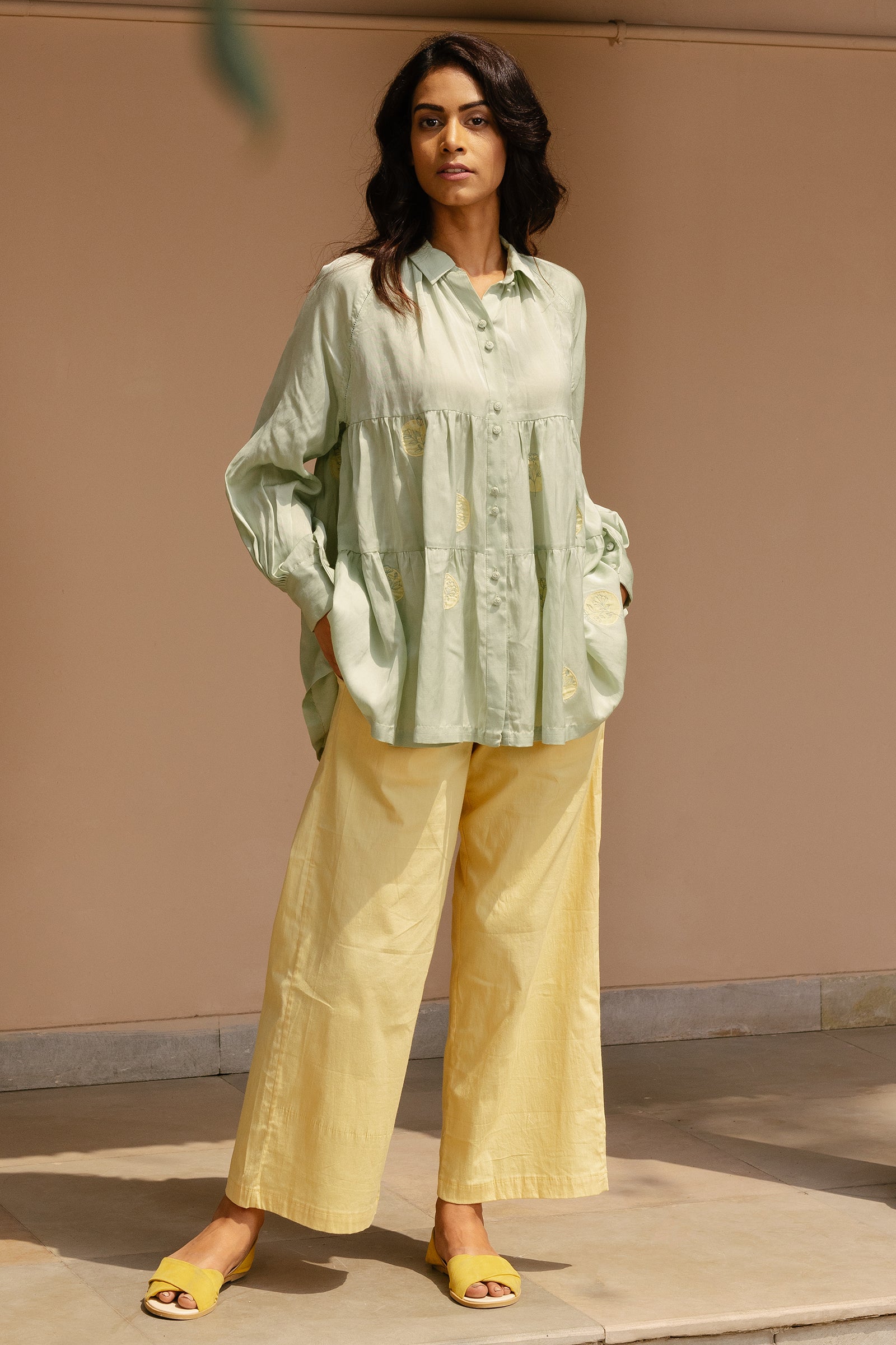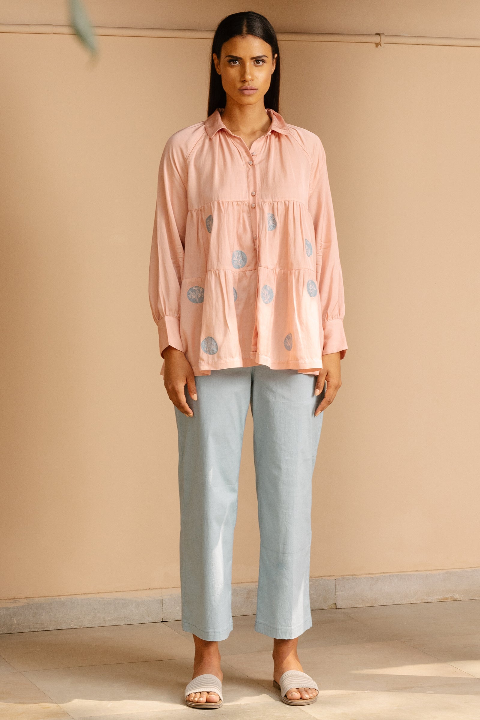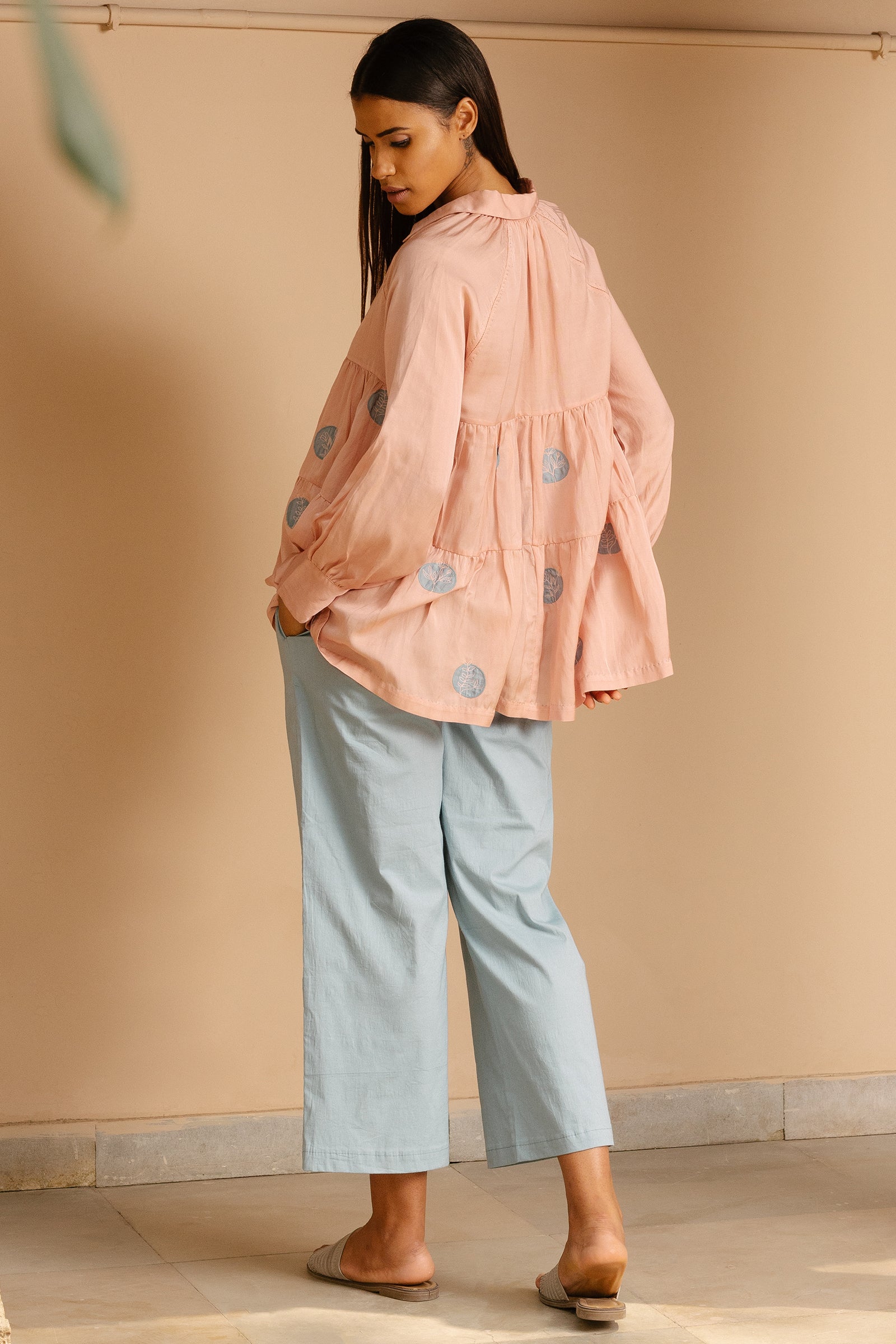Tiered top with raglan sleeves and hand embroidered polka patchwork