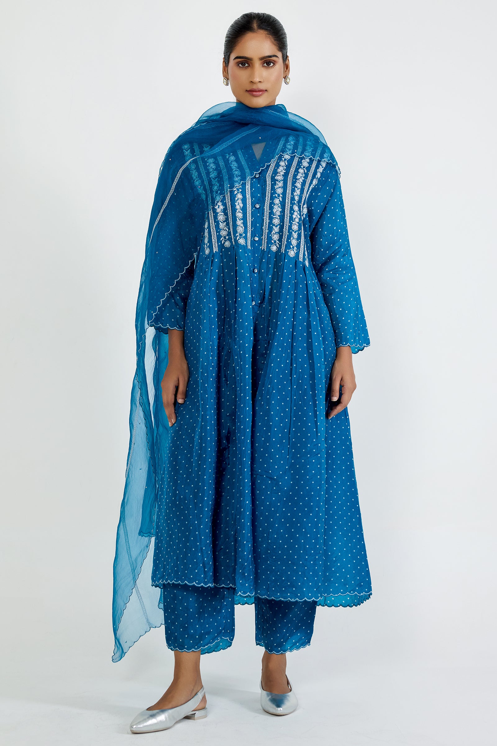 Button down pleated tunic with hand embroidered floral borders