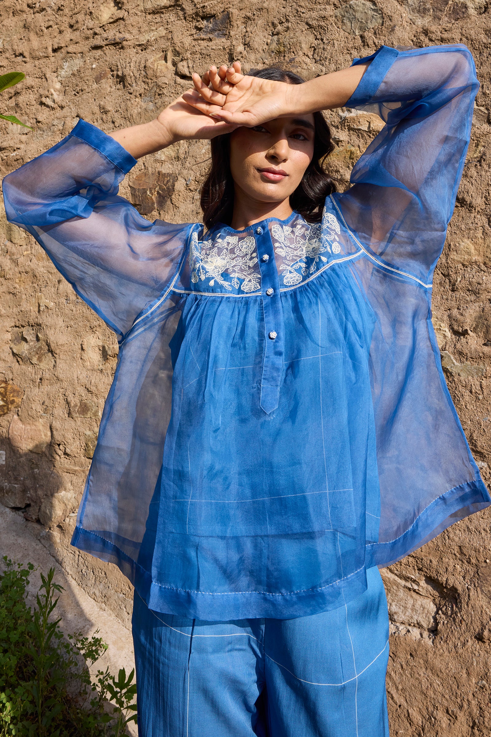 Sheer top with hand embroidery on yoke front and back along with camisole