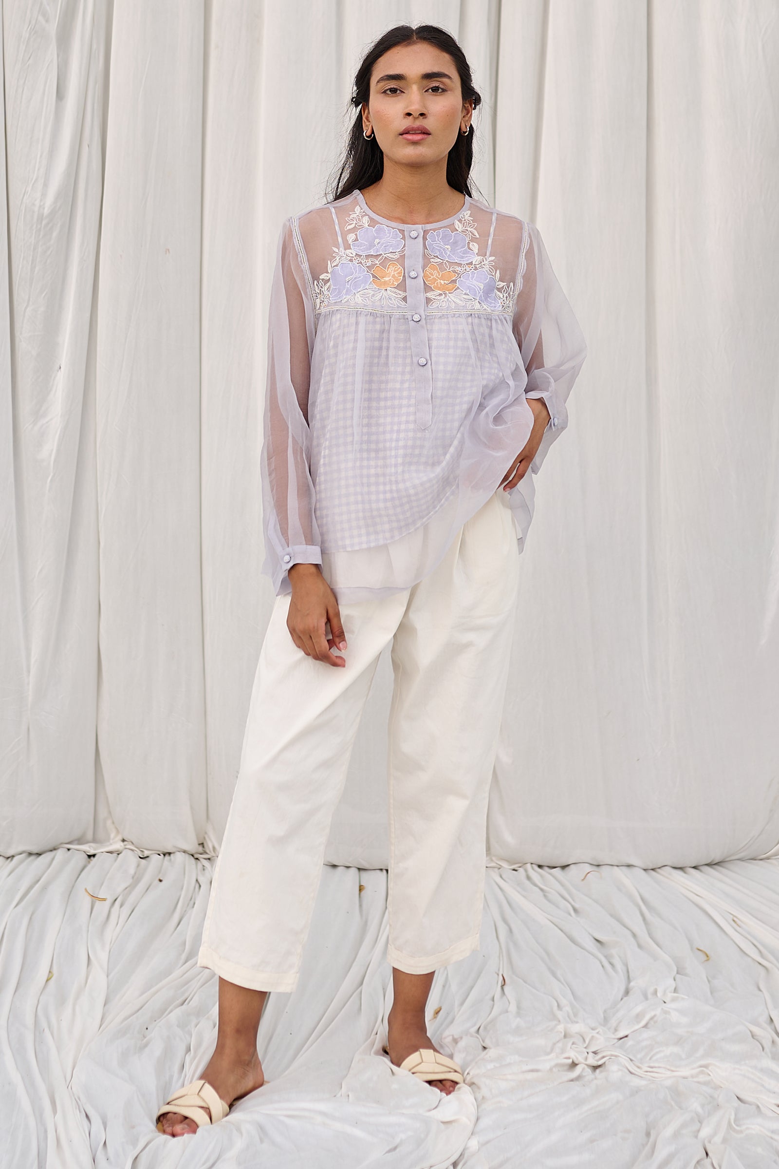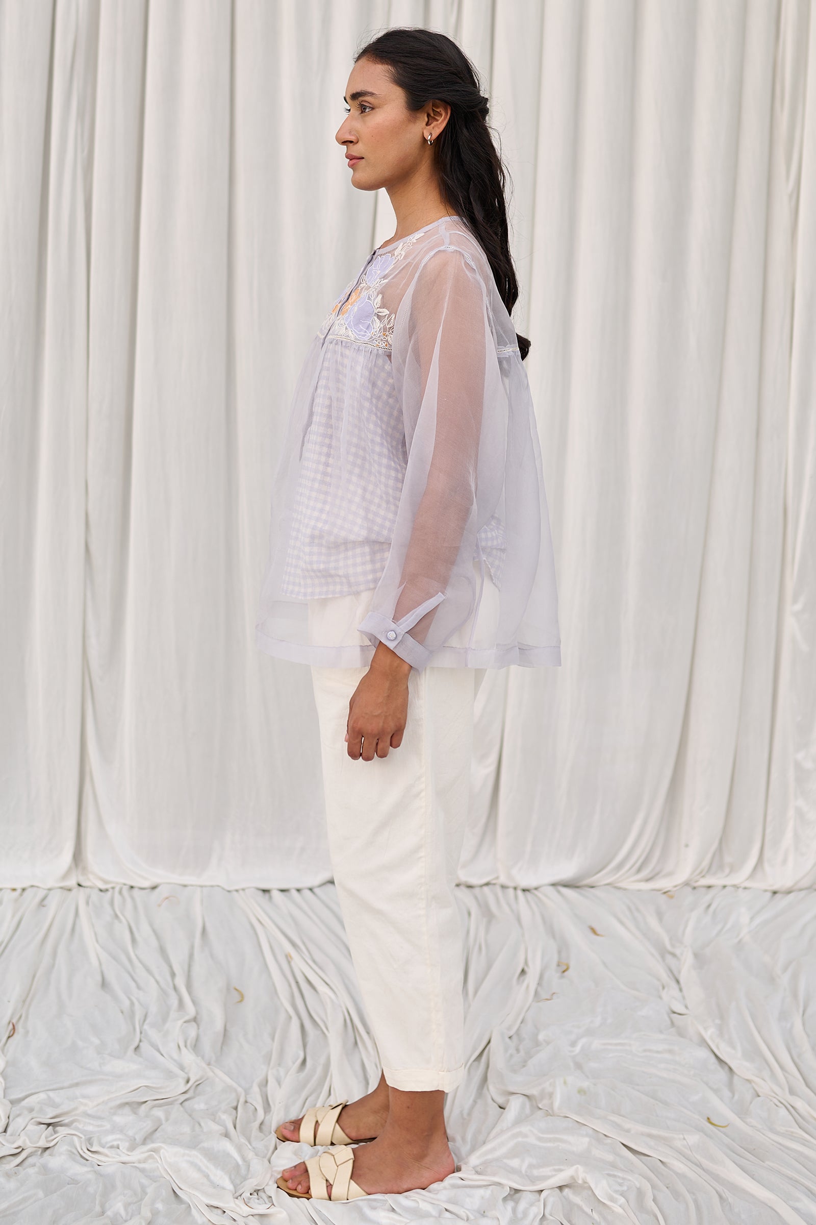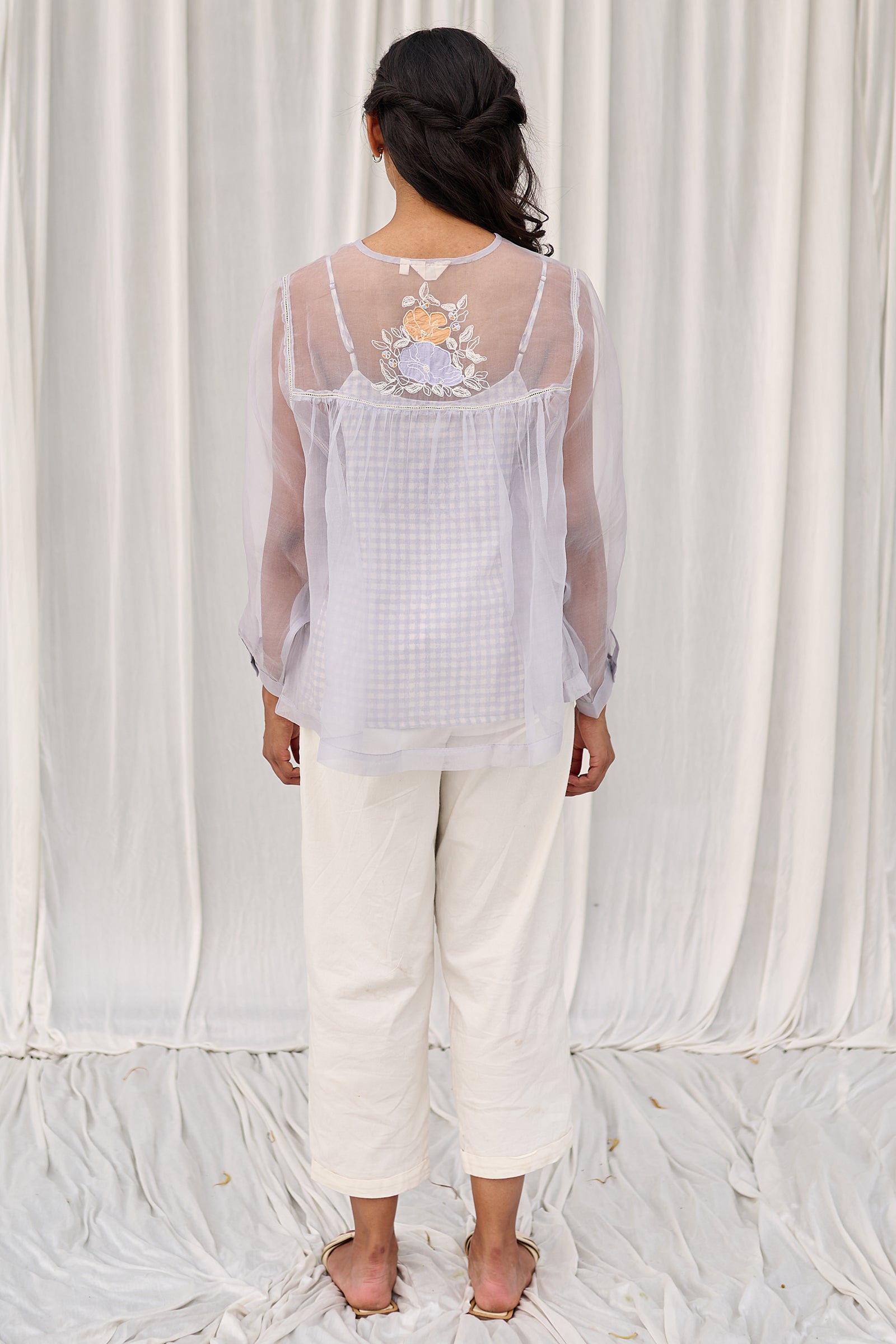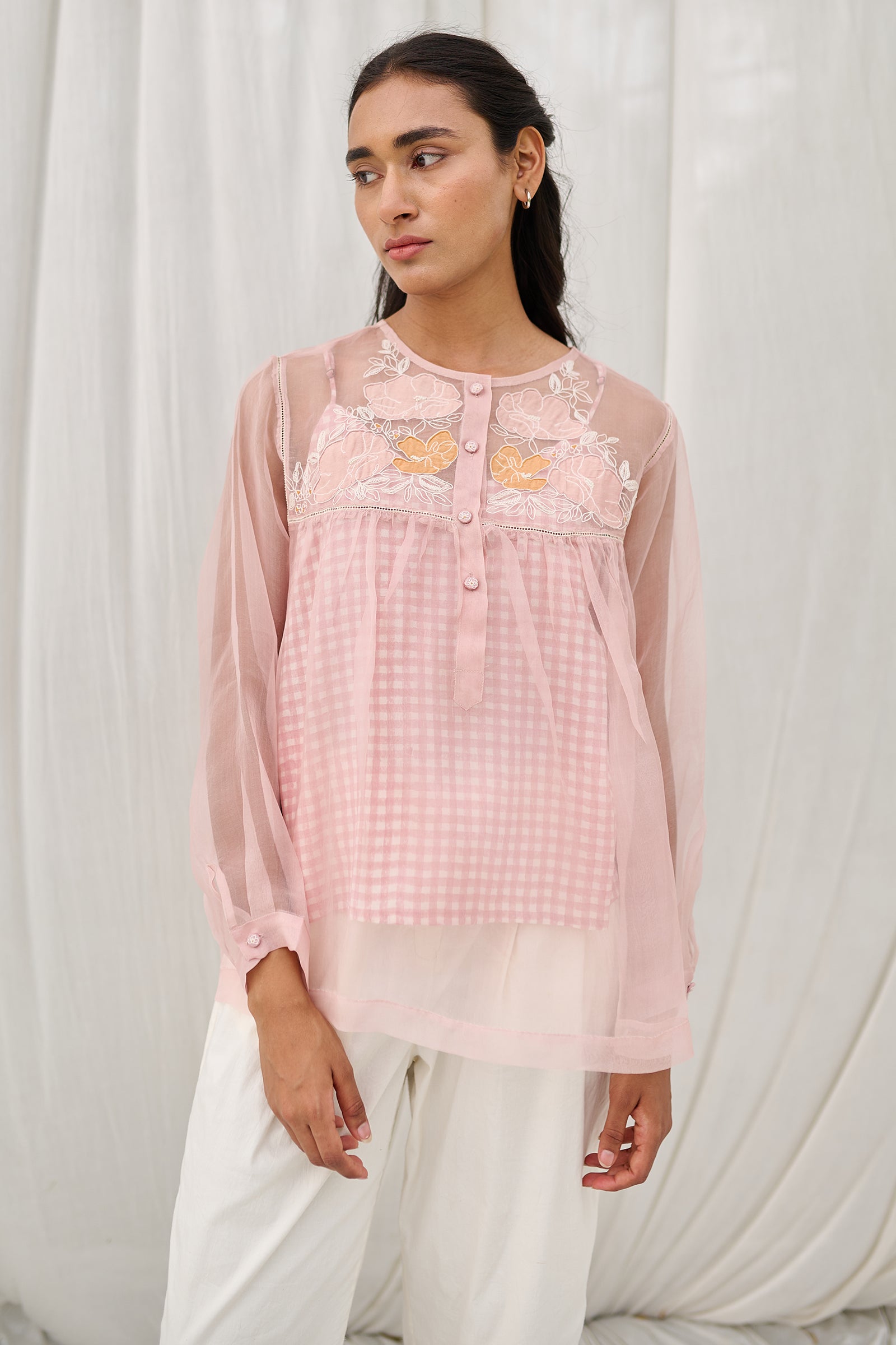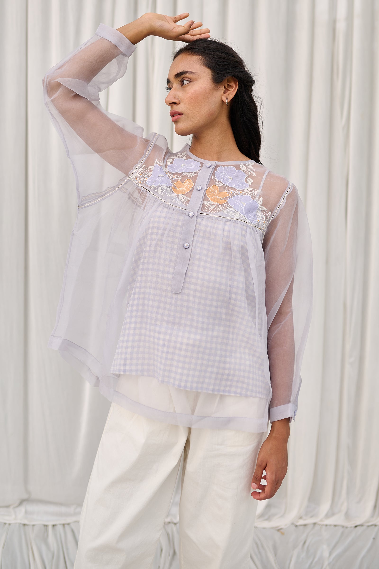 Hand appliqued floral yoke front and back with hand block pprinted checks lining