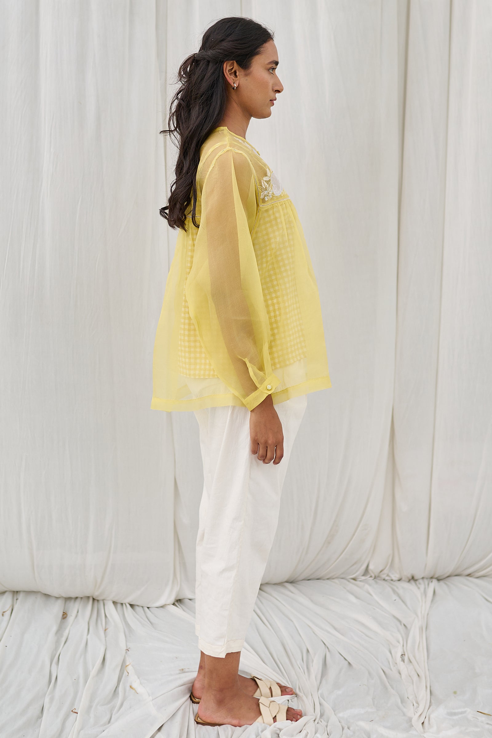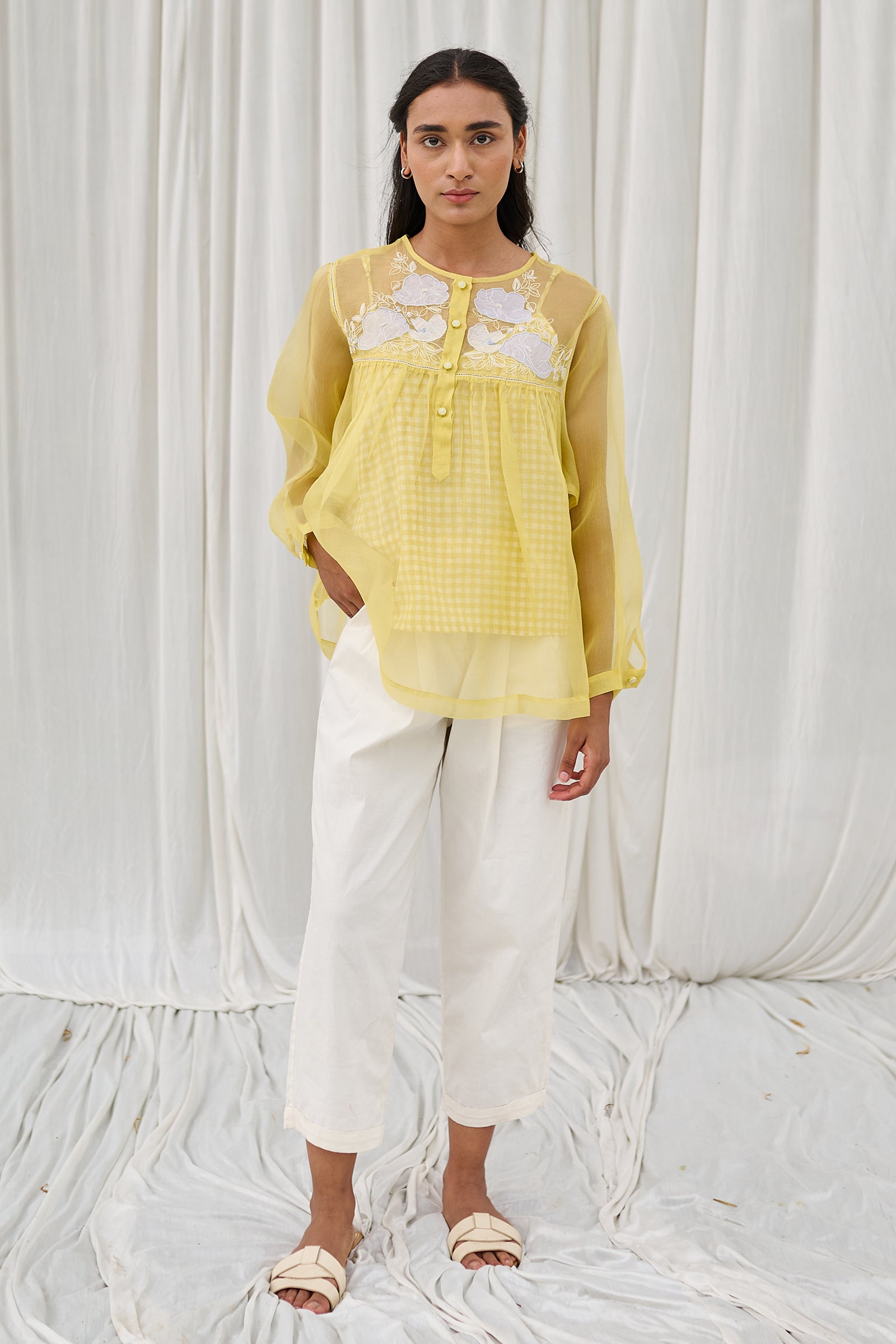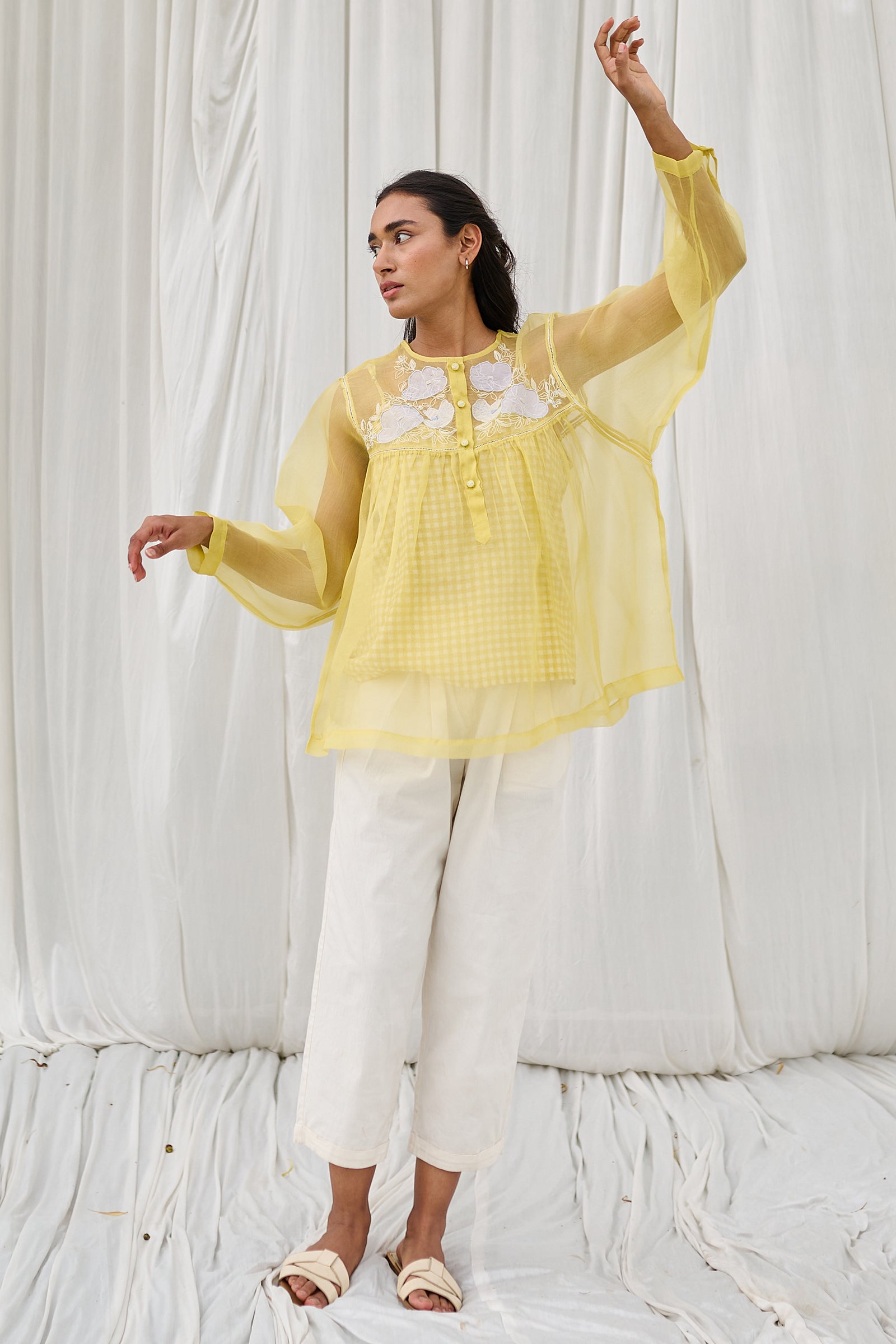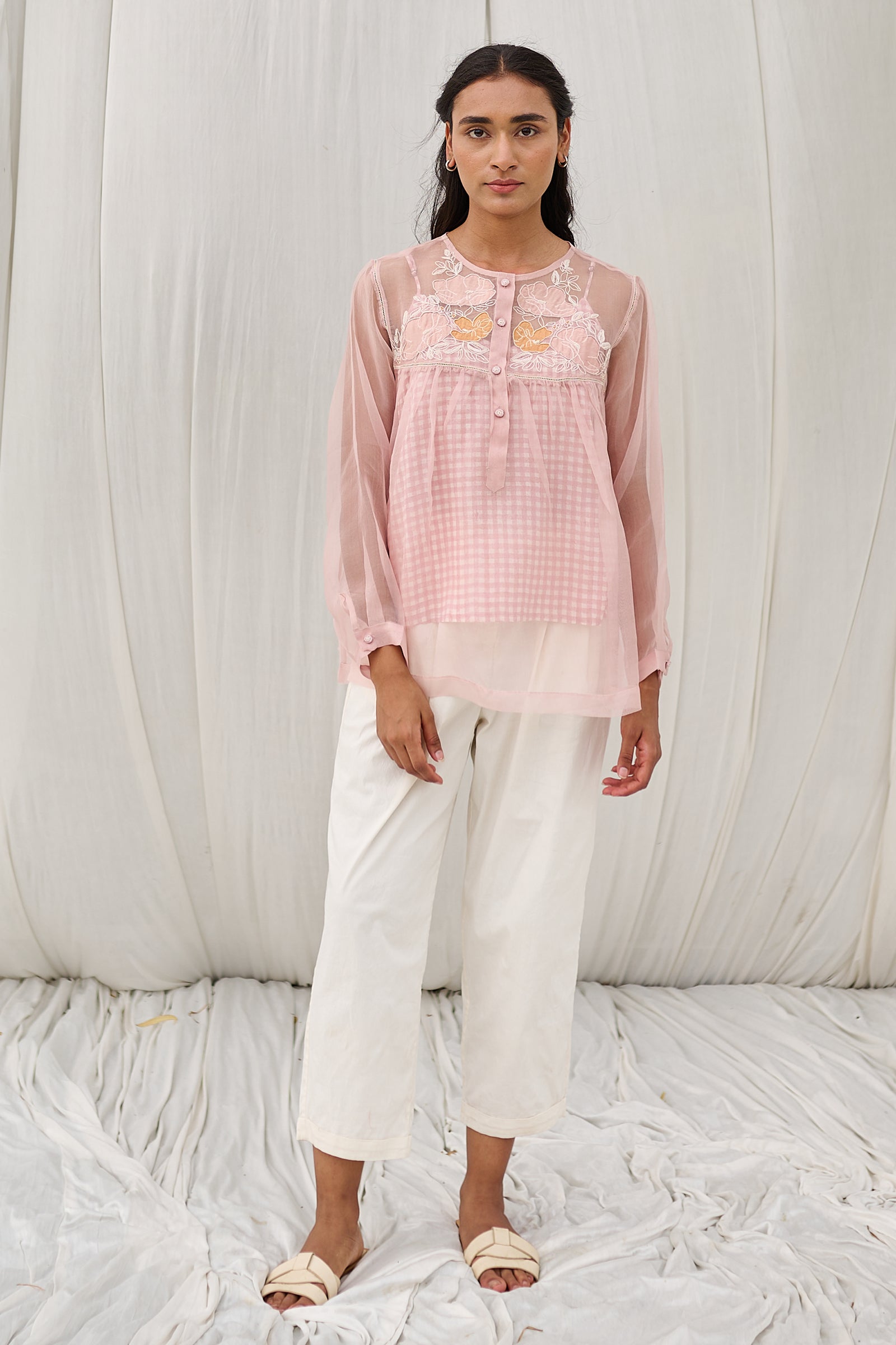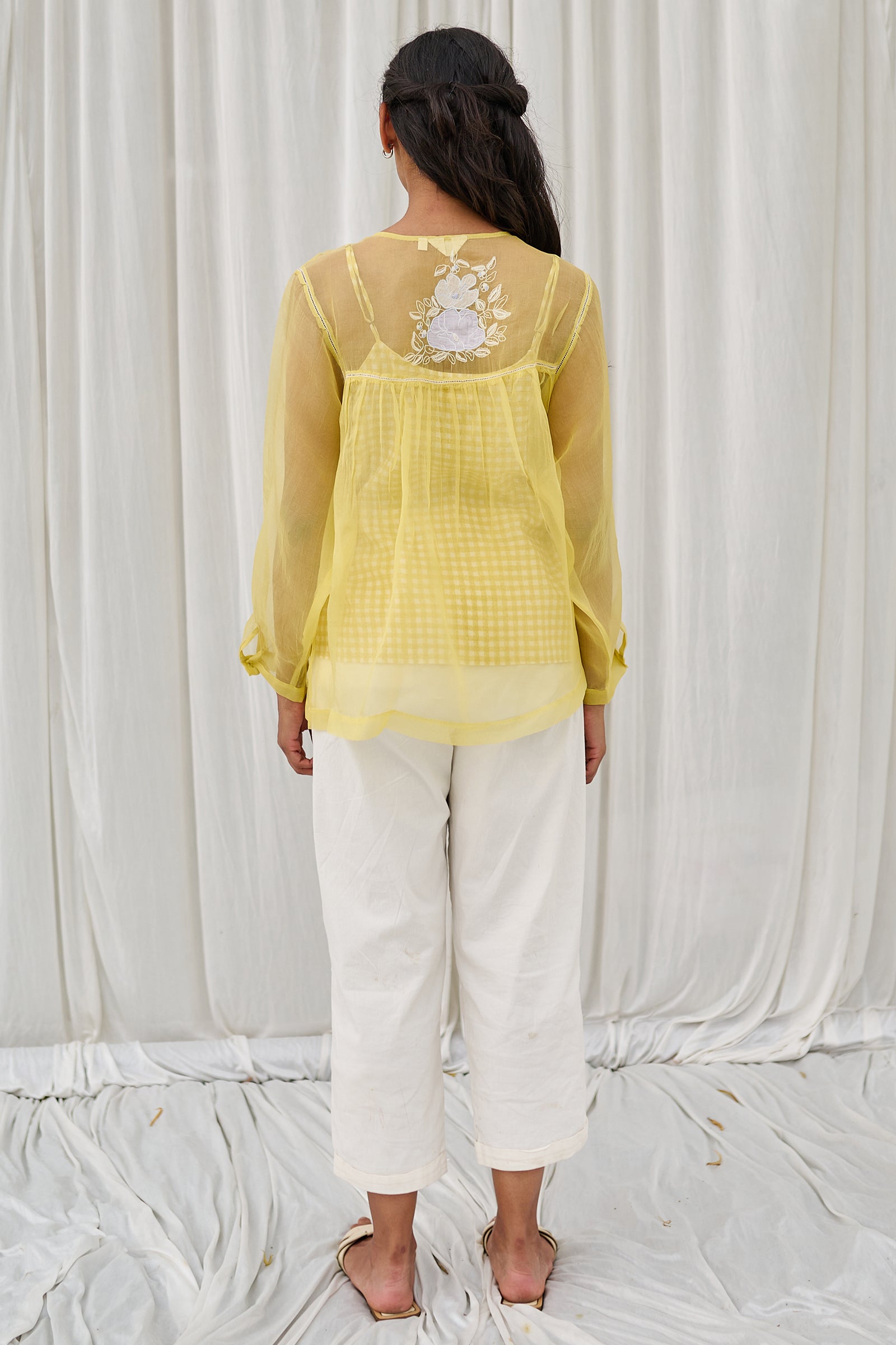 Hand appliqued floral yoke front and back with hand block pprinted checks lining