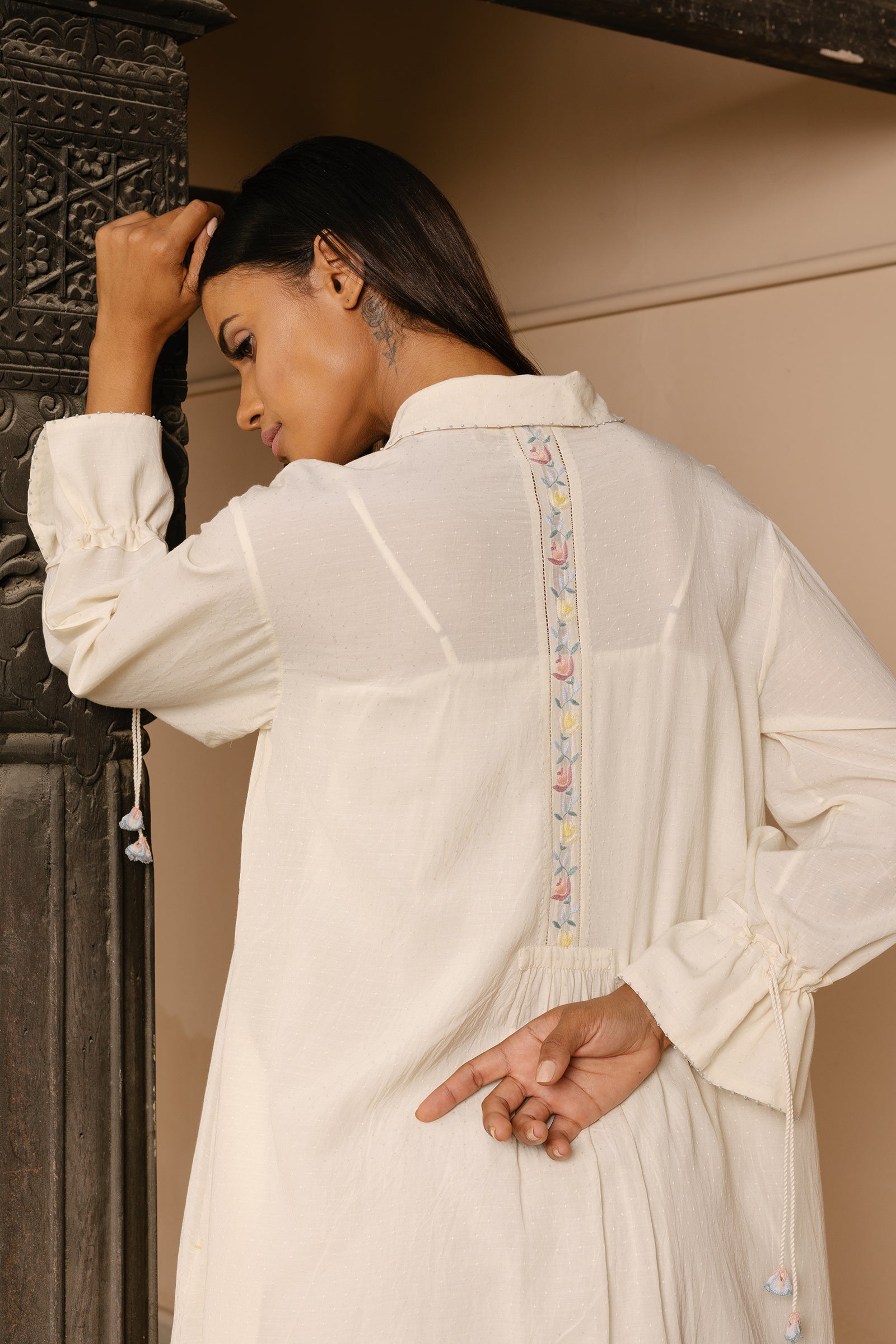 A line relaxed silhouette with hand embroidered borders