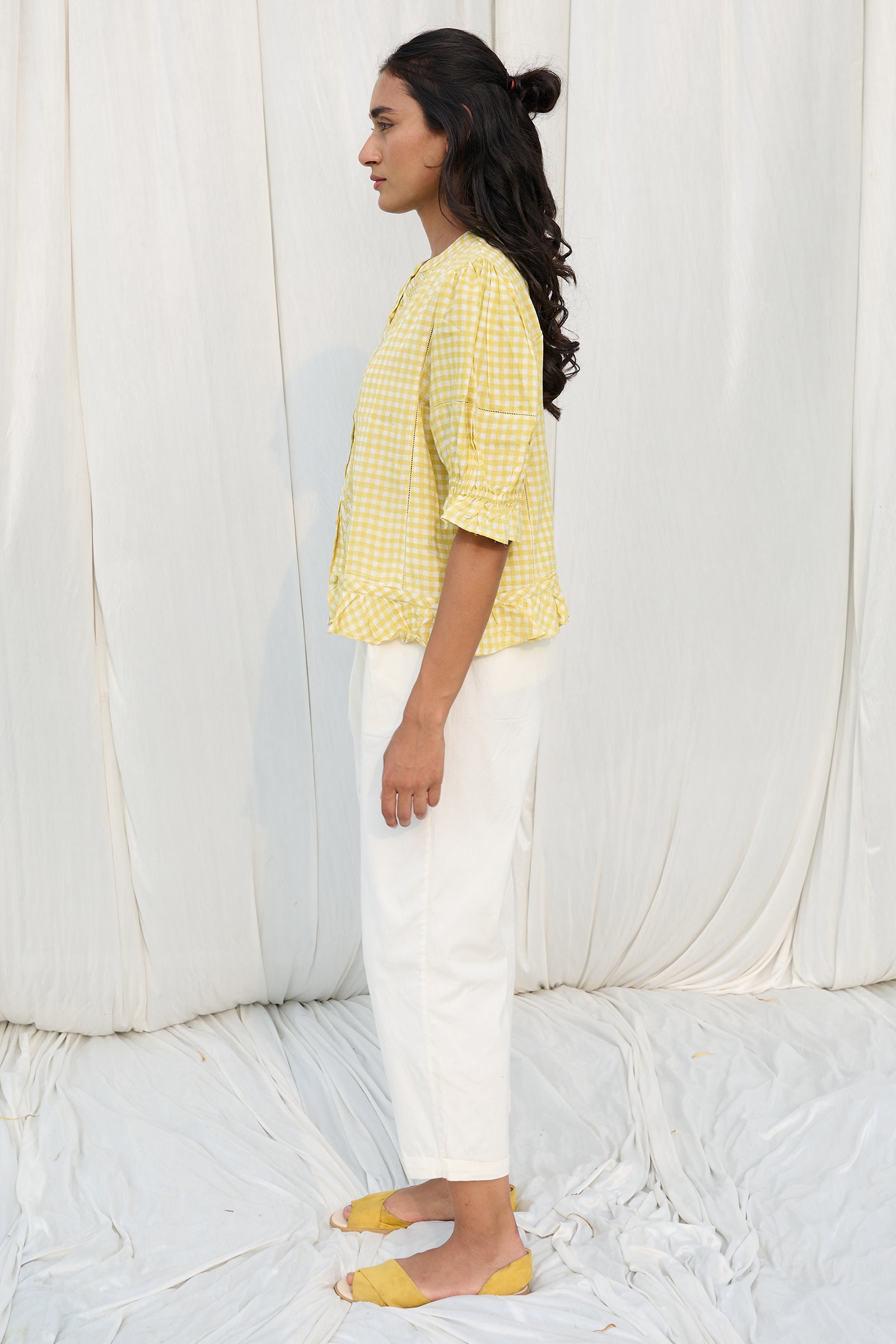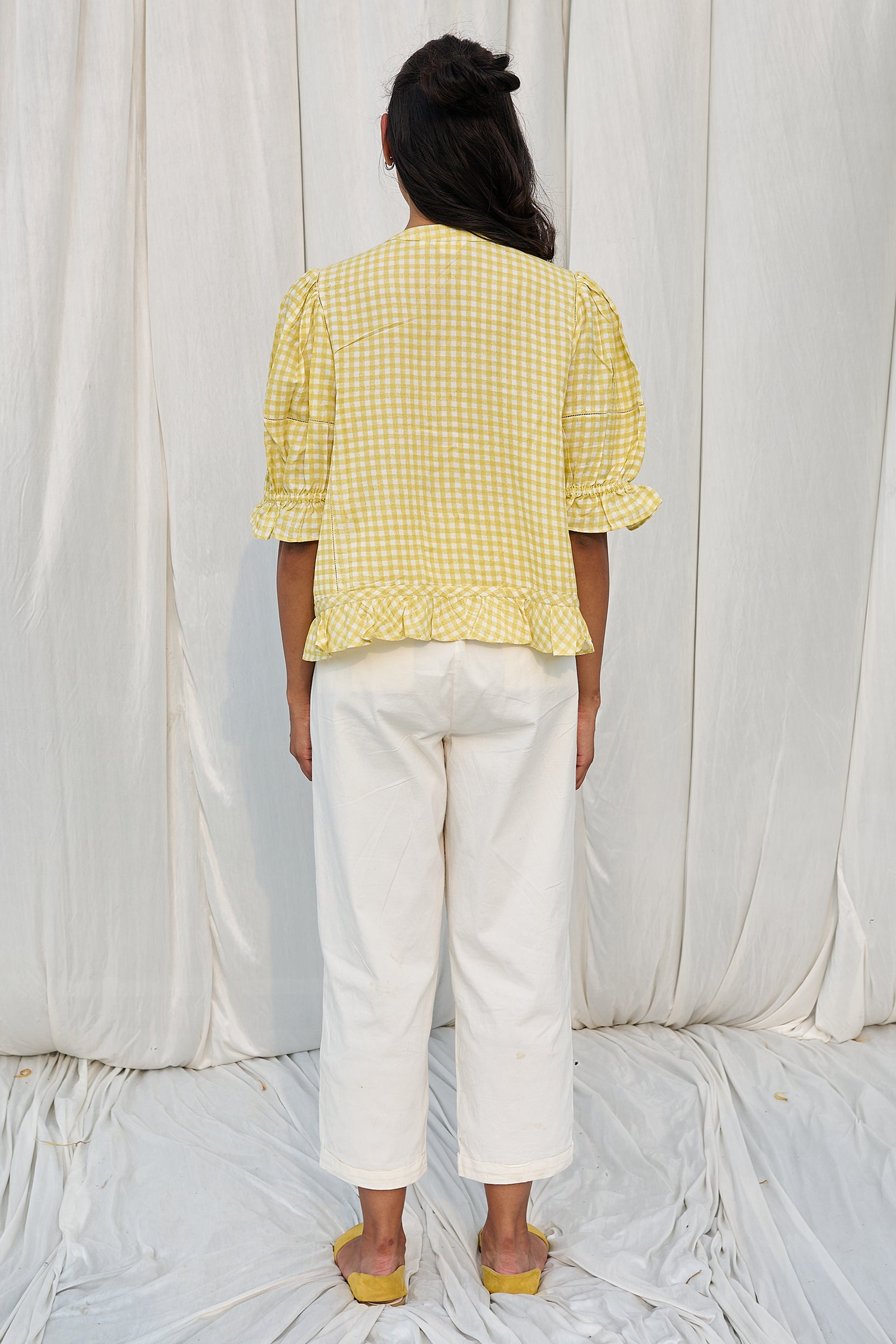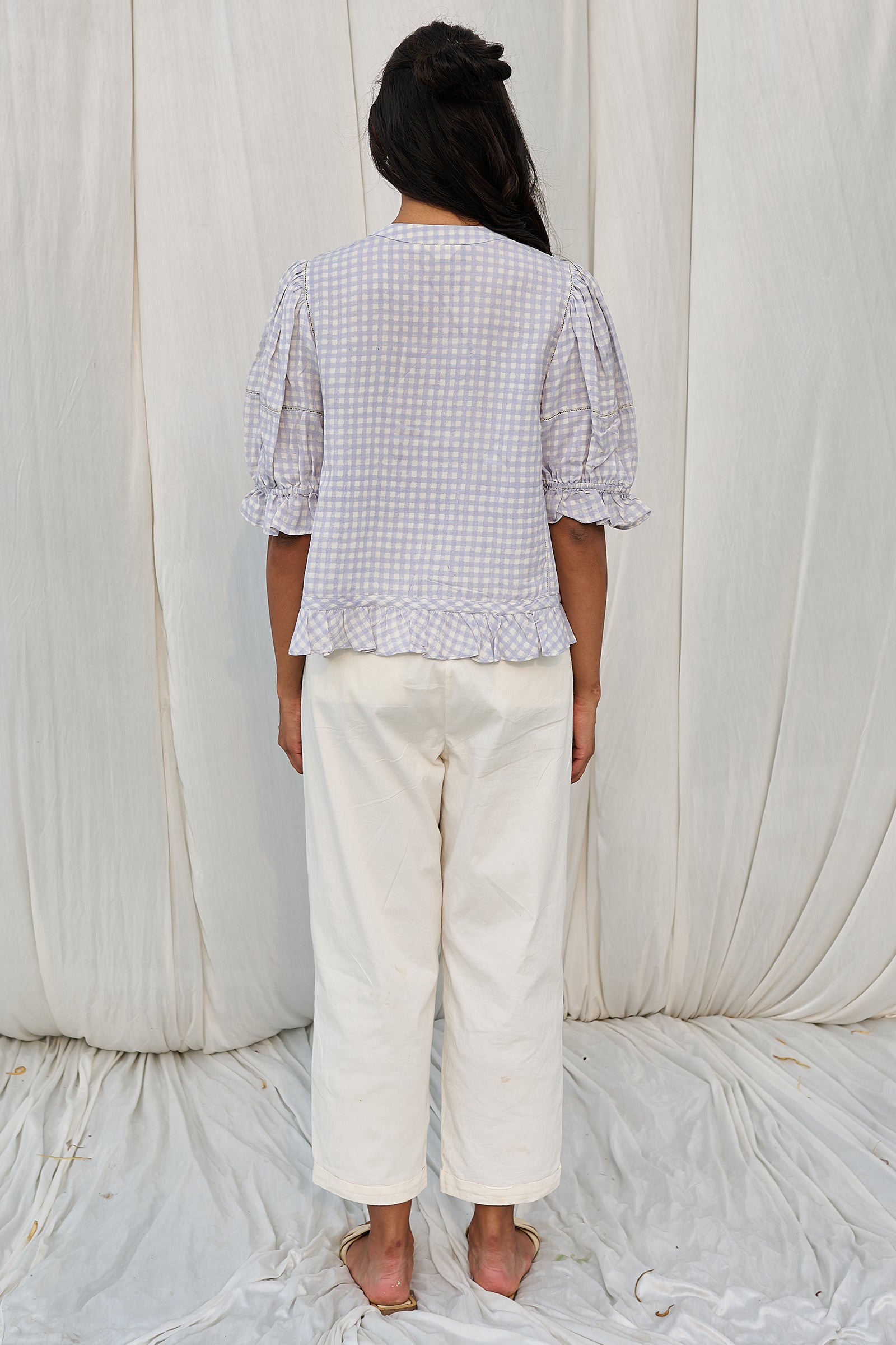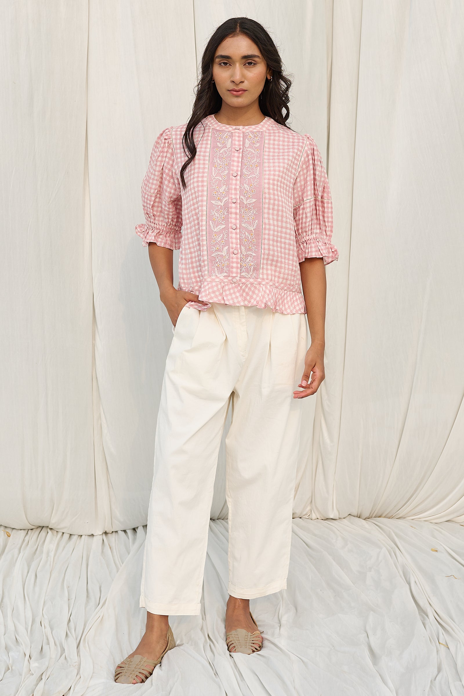 Hand block printed checks top with hand embroidered front panels