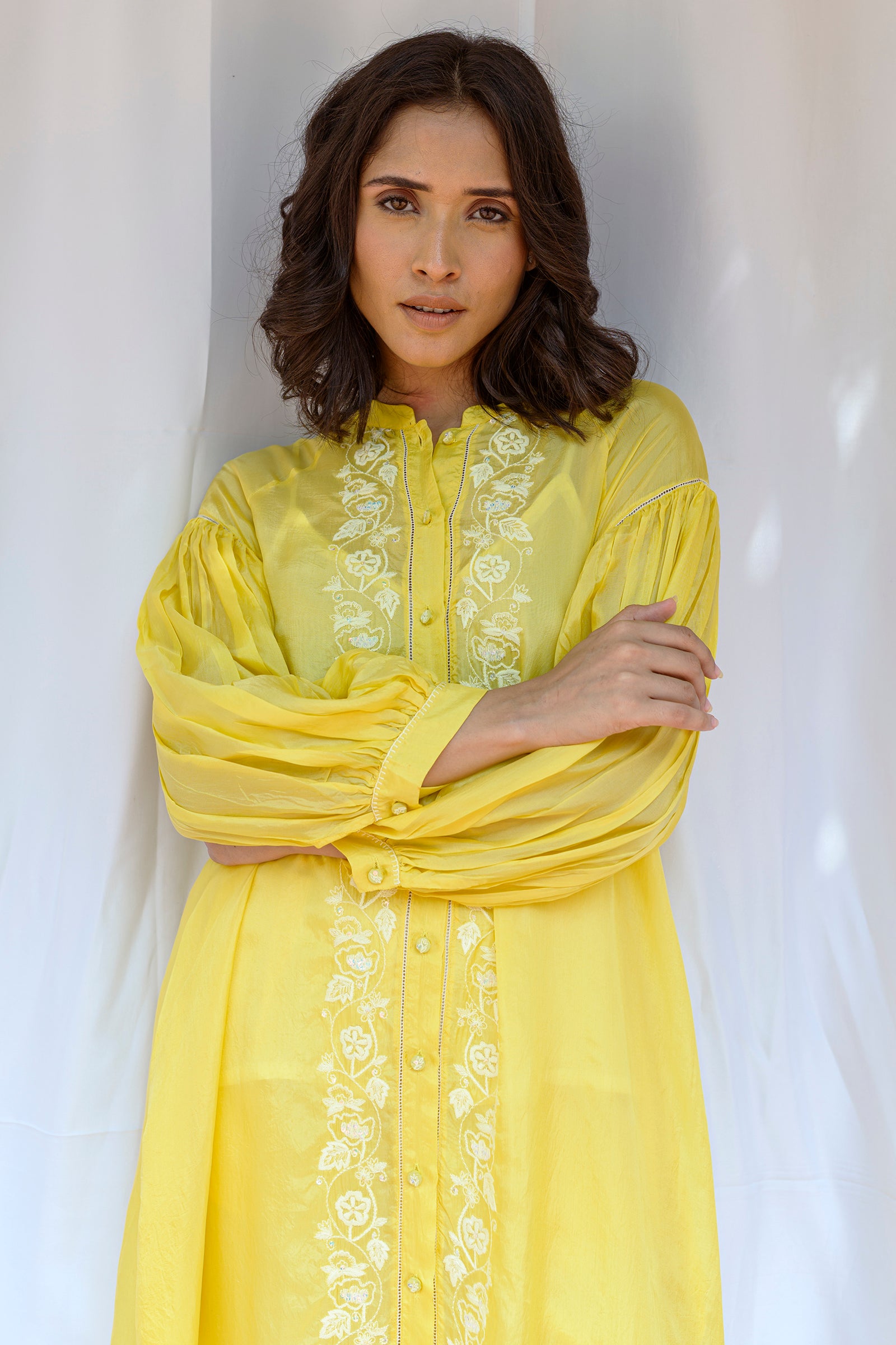 Raglan sleeves front open tunic with hand embroidered borders along with placket