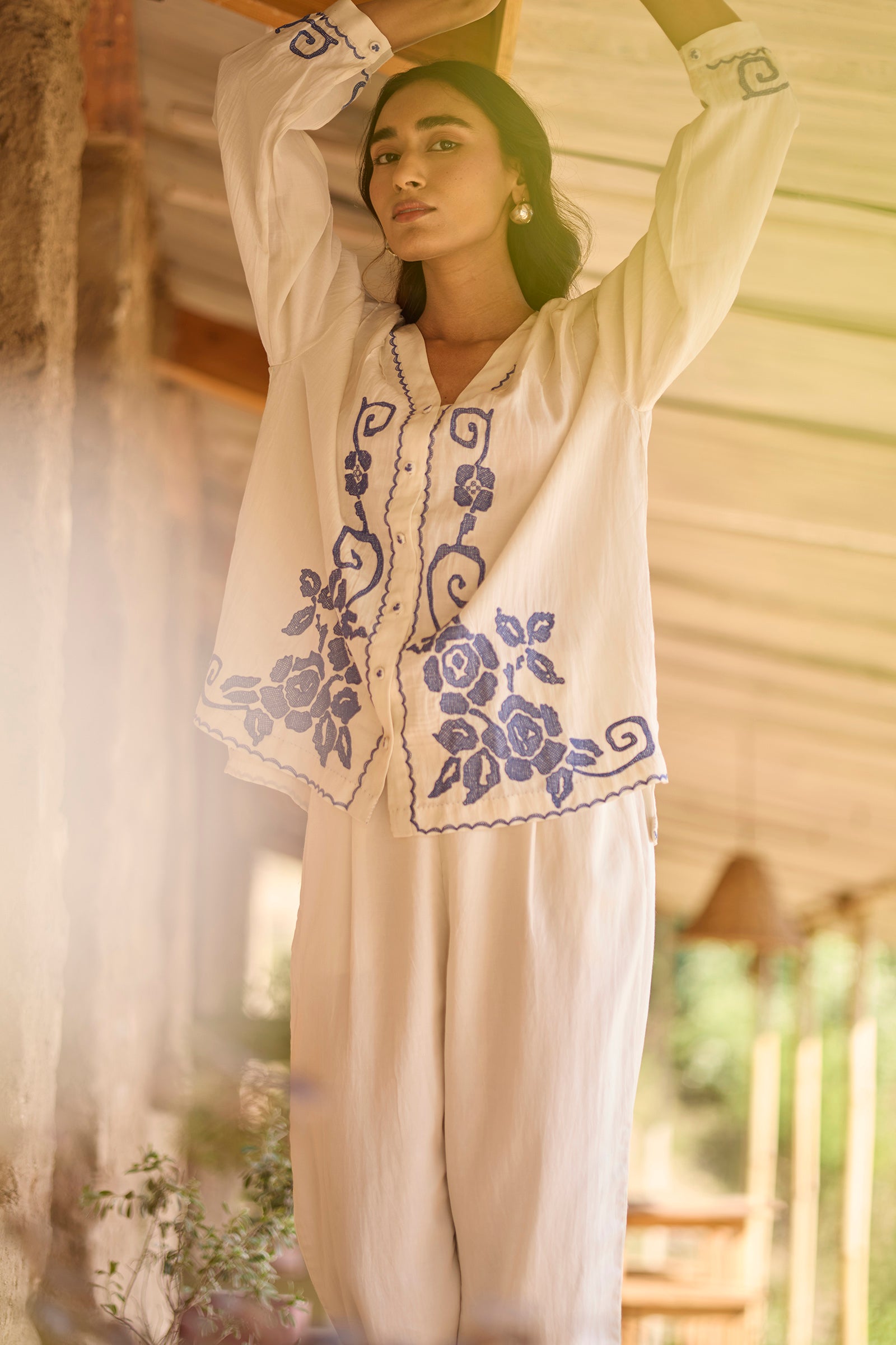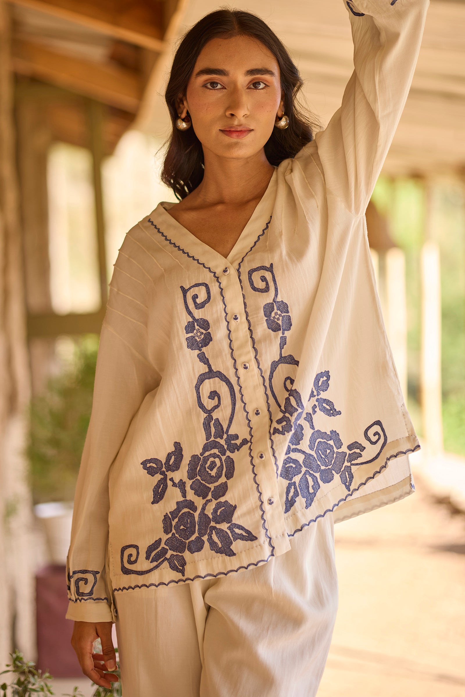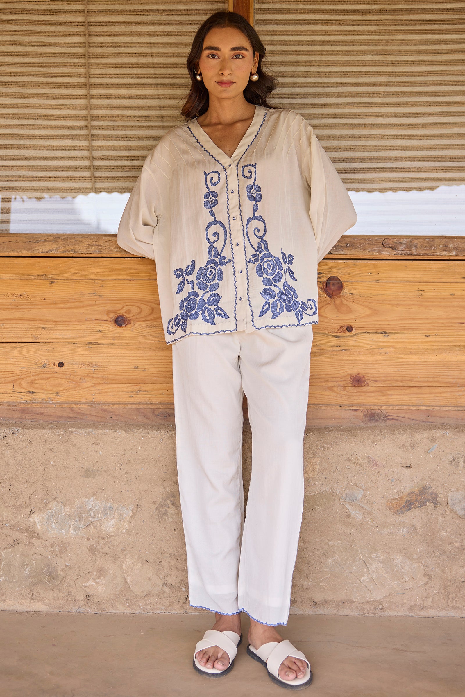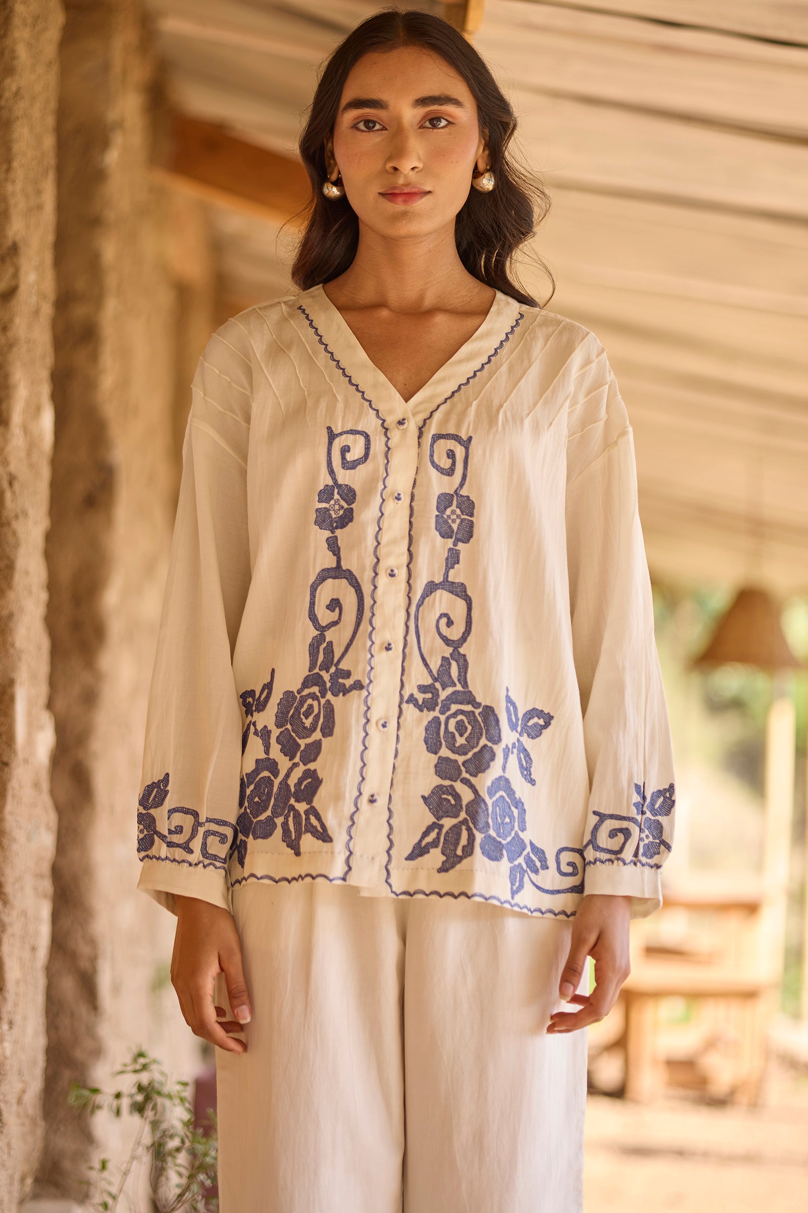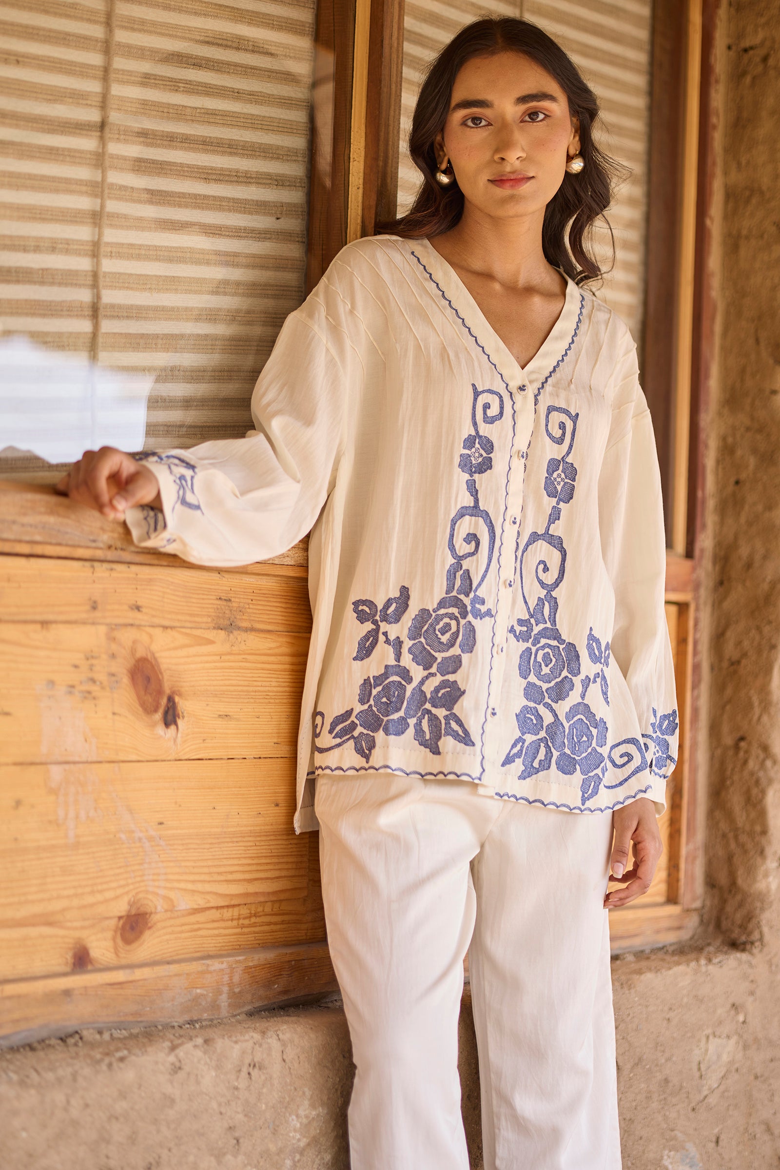 Drop shoulder pintuck detail front open top with hand embroidery