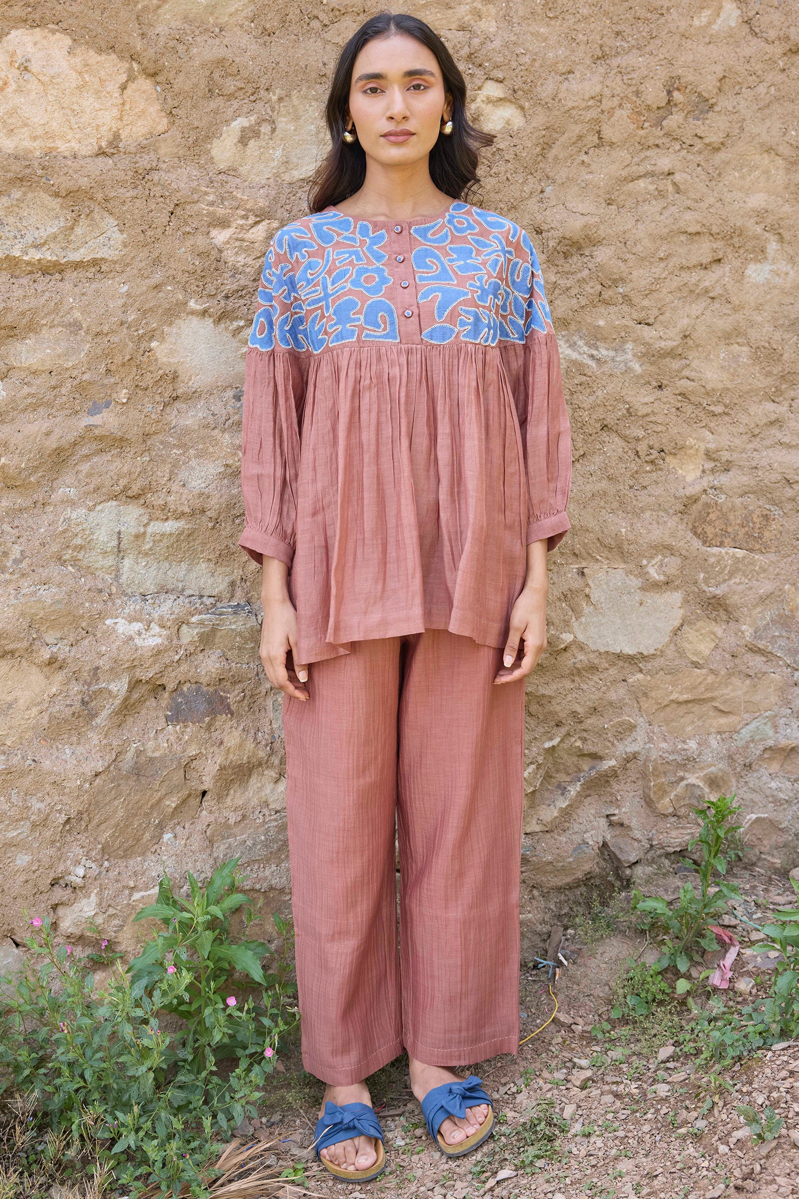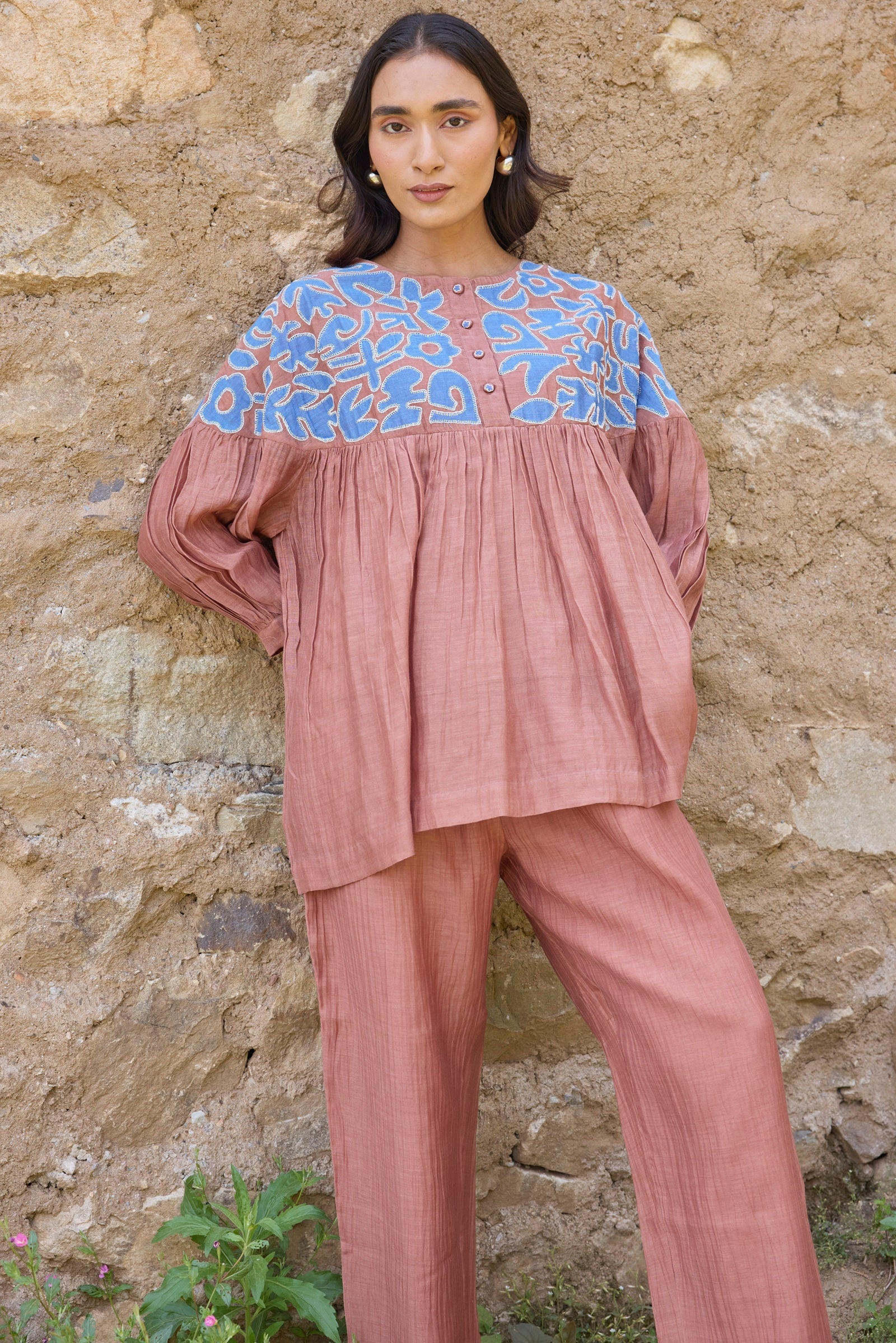 Hand applique yoke with gathered hem